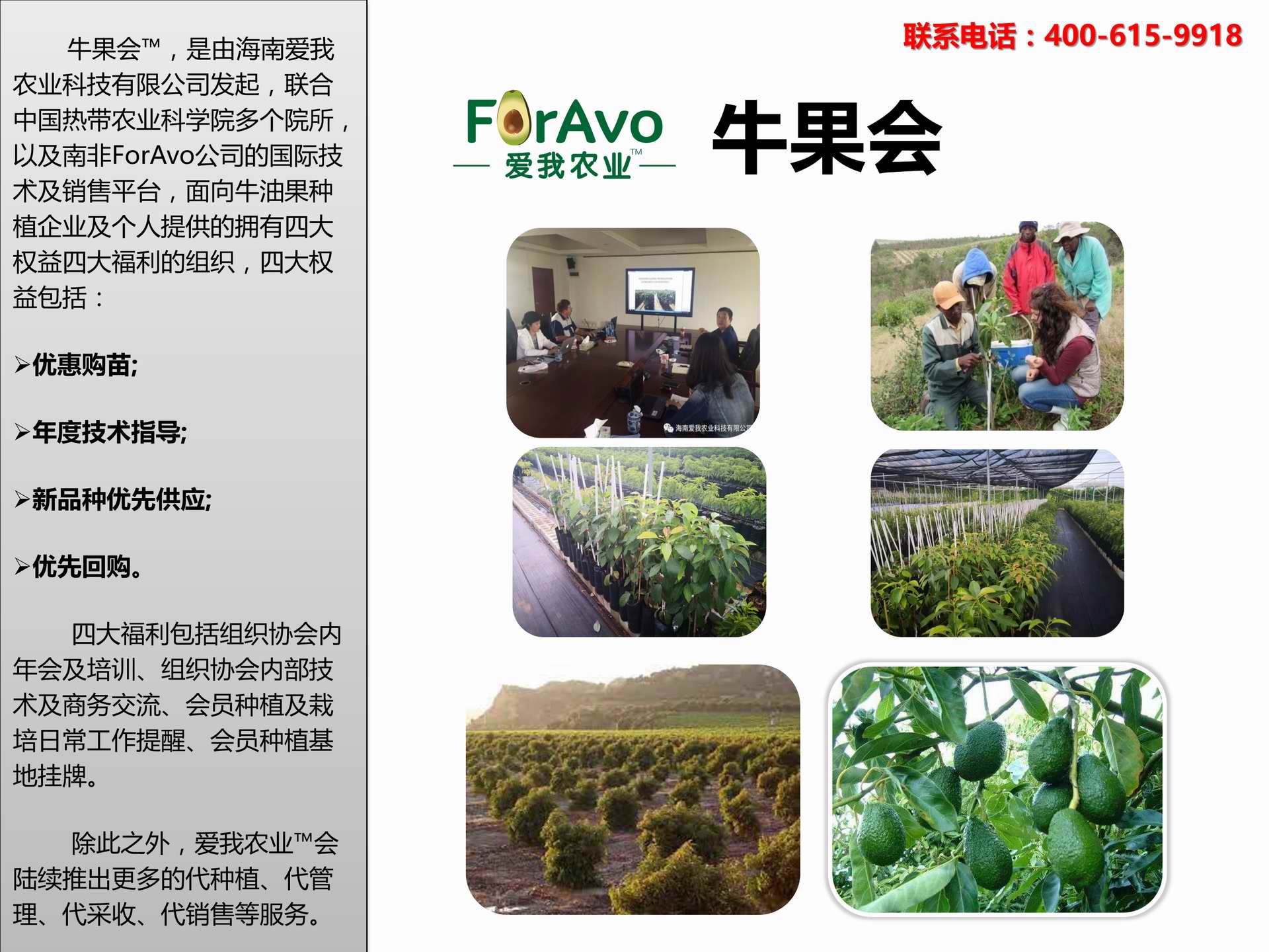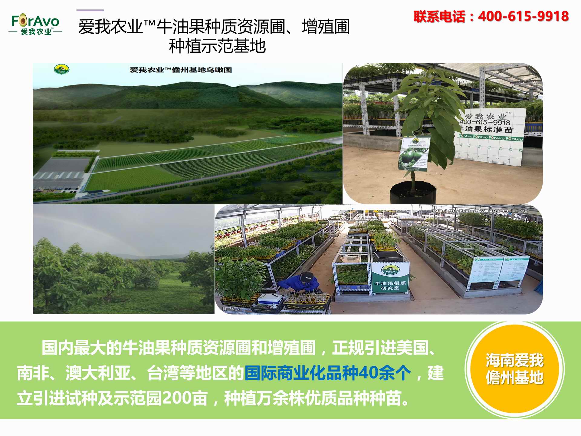 海南愛我農(nóng)業(yè)科技有限公司是一家綜合性的高科技農(nóng)業(yè)發(fā)展企業(yè),旗下愛我農(nóng)業(yè)TM致力于打造中國最大最強(qiáng)的牛油果種植企業(yè)。依托美國、南非、澳大利亞等擁有百年牛油果繁育、種植歷史以及產(chǎn)業(yè)鏈?zhǔn)袌龅膬?yōu)勢(shì),開展牛油果種苗繁育、種植技術(shù),種植加盟、深加工等產(chǎn)業(yè)。結(jié)合中國市場,面向廣大苗圃基地、種植農(nóng)場、合作加工等企業(yè),推出的適合規(guī)?;?、標(biāo)準(zhǔn)化的牛油果全產(chǎn)業(yè)鏈服務(wù)。 Hainan Foravo Agricultural Technology Co., Ltd. is a comprehensive high-tech agricultural development enterprise , dedicated to building the largest and most powerful avocado plantation enterprise in China. Relying on the advantage of avocado nursery, planting history, and the industrial chain over 100 years in the United States, South Africa, Australia, we are carrying out nursery, planting, proce...